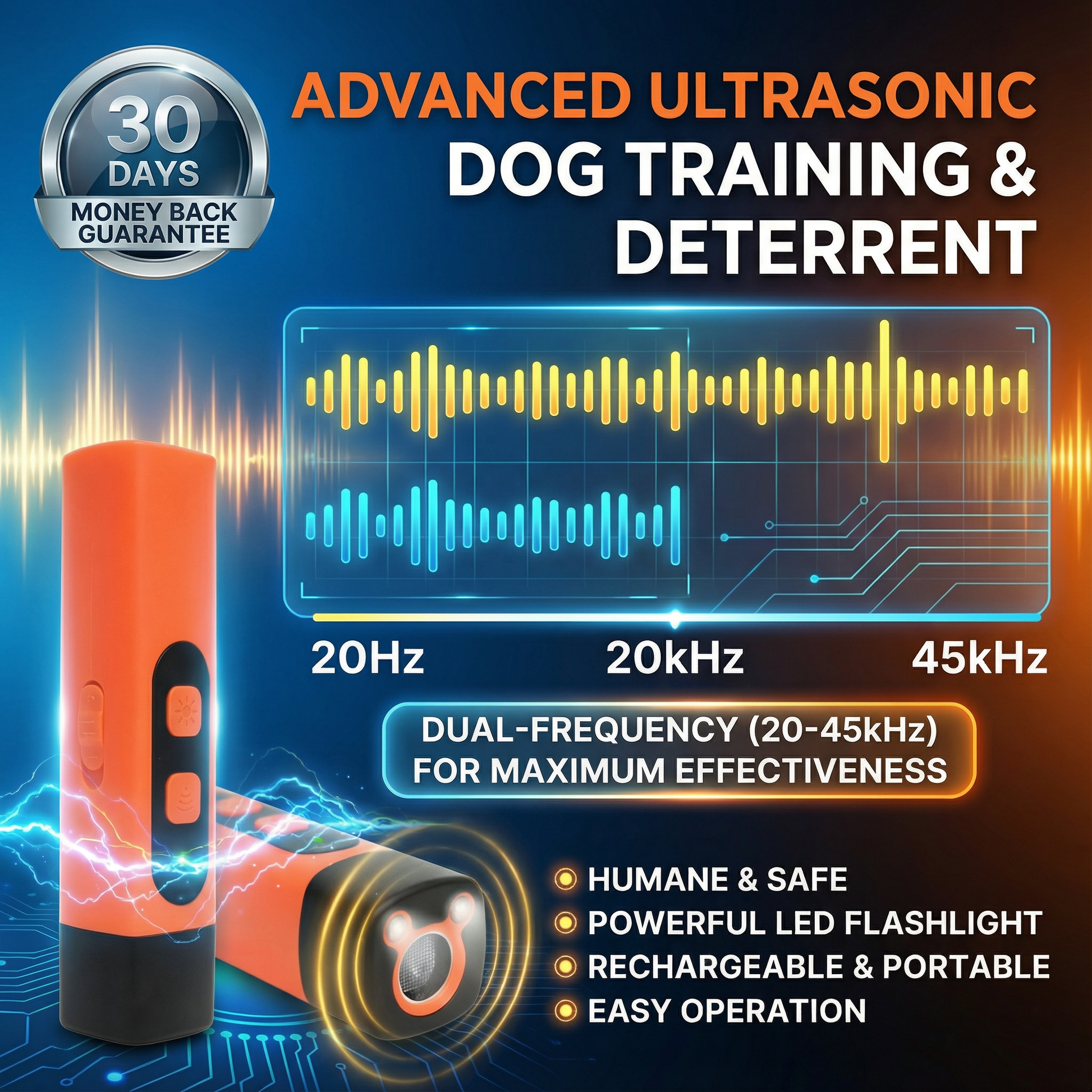 Dogs hear a much wider range of frequencies than humans. This device emits a safe ultrasonic tone that dogs can detect, helping grab their attention and interrupt barking in the moment.